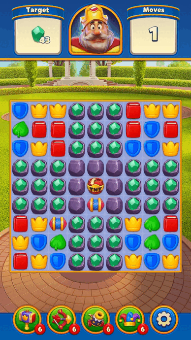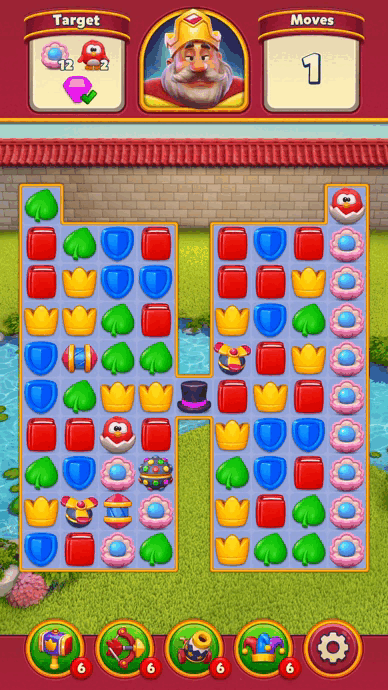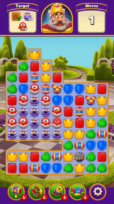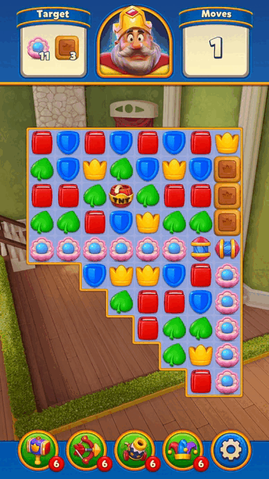 | How to play? Match Items Stars & Tasks Lives Coins Bonus Levels King's Nightmare Power-ups: Rocket | Propeller | TNT | Light Ball Power-up Combinations: Rocket | Propeller | TNT | Light Ball Boosters: Pre-Level Boosters | Royal Hammer | Arrow | Cannon | Jester Hat |